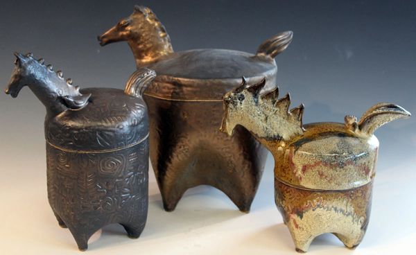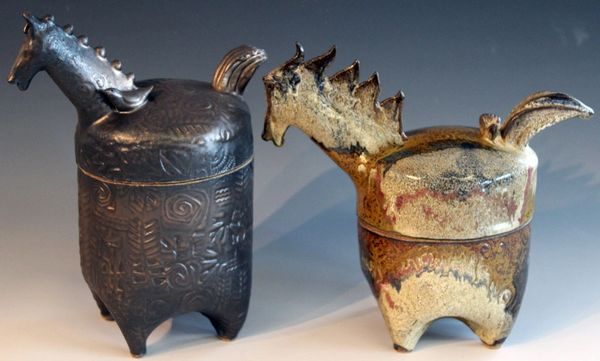 Paintings on clay forms using red clay and stoneware.